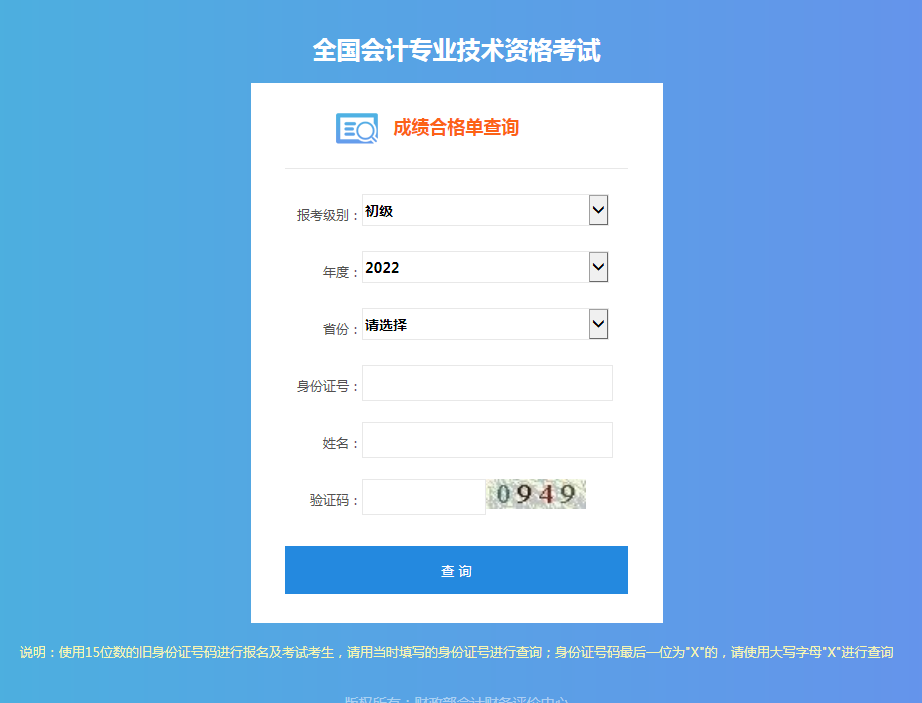 第四步:按要求分别输入“报考级别”、“年度”、“省份”、“身份证号”、“姓名”和“验证码”后,点击“查询”。